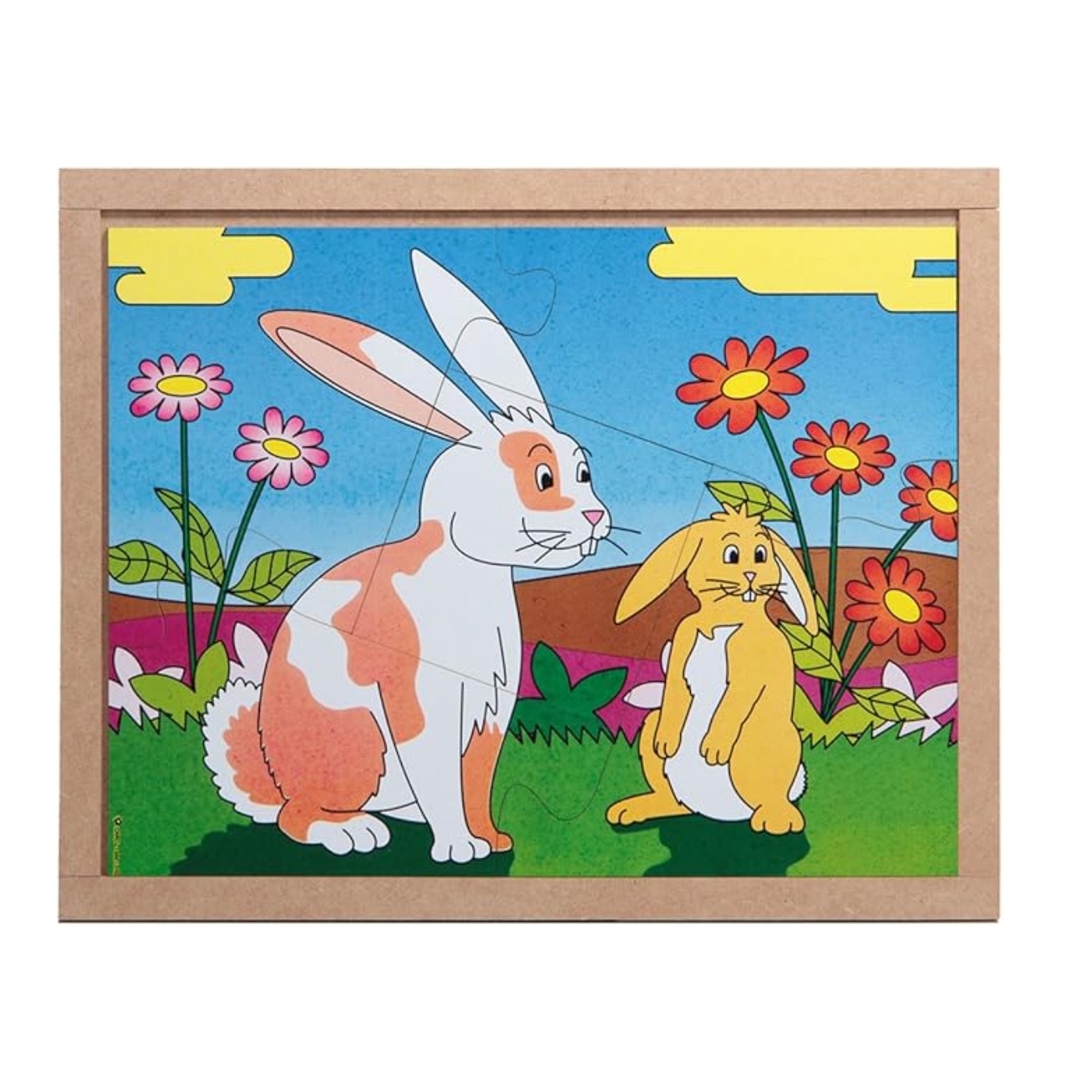 Confeccionado em MDF composto por 5 peças pintadas e serigrafadas em policromia ultravioleta atóxica. Ilustração: coelho e filhote. Medidas do quebra-cabeça montado: 30 x 23 cm. Acompanha 1 base de MDF em baixo relevo (para montar o quebra-cabeça), medindo 33,5 x 26,5 cm. Embalagem: película de PVC encolhível.